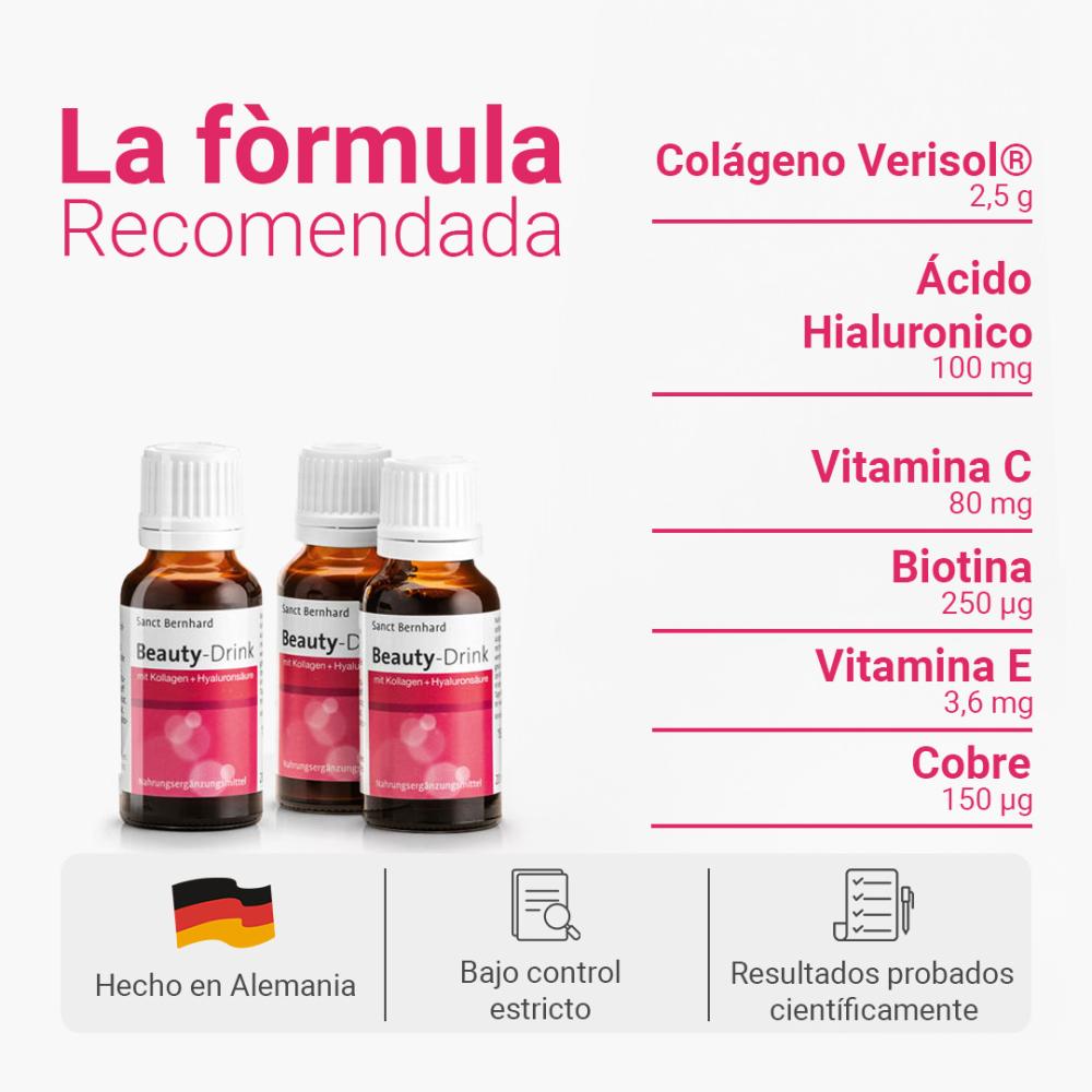 Agua, zumo concentrado de Aronia, fresa, grosellas negras, moras y bayas de saúco; Péptidos de colágeno (11,6%), jarabe de agave, ácido hialurónico (0,5%), vitamina C, sorbato de potasio (conservante), gluconato de zinc, vitamina E, gluconato de cobre, betacaroteno, maltodextrina (agente de carga), biotina.